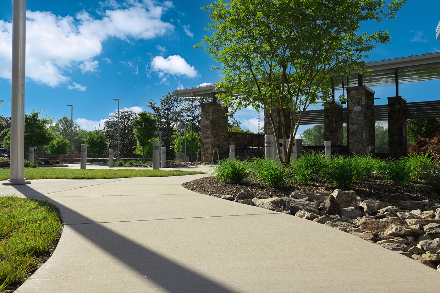 The master plan incorporated a thoughtful selection of low water use, deer-resistant plants, and an efficient irrigation system. Large southern magnolias and willow oak trees were preserved and protected during construction and served as the signature plant material to establish the theme for the new landscape design. Water sensors and a smart irrigation controller operated rotor and drip zones for turf and planting beds. This attention to detail and sensitivity to existing conditions not only enhanced the site’s aesthetics, but also contributed to its overall sustainability.